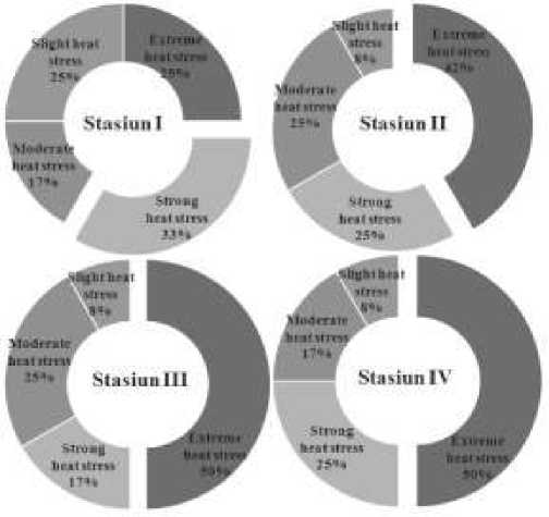 Status thermal comfort lingkungan atmosfer permukiman di wilayah Kecamatan Denpasar Barat 100 % berada dalam tekanan termal panas panas dengan rentang dari slight heat stress sampai dengan extreme heat stress. Jika dilihat berdasarkan rerata indeks termal PET pada permukiman klasifikasi rendah, sedang, tinggi dan sangat padat masing-masing yaitu 35,23°C, 38,68°C, 39,30°C,dan 38,95°C, maka kondisi tingkat tekanan fisiologis berada pada tingkat “Strong heat stress”. Persentase tekanan fisiologis termal masing-masing klasifikasi dapat dilihat pada Gambar 3. Namun hal ini berlaku untuk lingkungan atmosfer yang berada di luar naungan bayangan pepohonan dan bangunan yang merupakan obyek penelitian ini. Sebagaimana diketahui bahwa penelitian Mayer dan Matzarakis (1998) menunjukkan terjadi penurunan tingkat tekanan