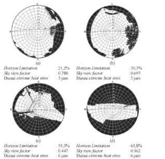 nilai Horizon limitation, SVF dan durasi extreme heat stres (Gambar 4). Hasil analisis menunjukkan nilai SVF yang lebih tinggi memberikan peluang paparan radiasi matahari berdurasi yang lebih panjang namun demikian memiliki keseimbangan antara penerimaan (heat gain) dan pelepasan panas (heat loss) yang lebih baik.