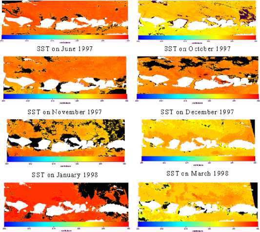 The monthly distributions of SST in eastern part of Indonesia Archipelago during 1997 to 1998 are shown in Figure 1. Generally, the SST in northern Lesser Sunda (Bali, Lombok, Sumbawa and Flores) was 0.5 – 1oC higher than southern part. The SST on June 1997 around 28oC to 29oC was warmer than October 1997 (26oC to 27oC), but from November 1997 to March 1998 the SST is almost the same (28oC to 29oC). On October 1997 and October 1998, the SST was 1 – 2oC cooler than another month. On