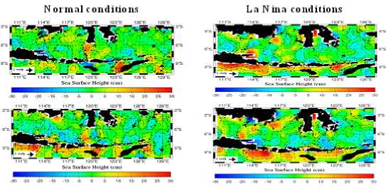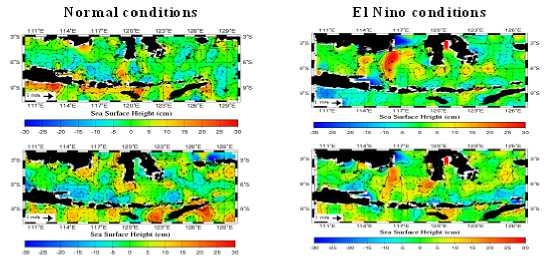 During El Nino events, the SSH in southern Indonesia Archipelago became 10 – 30 cm lower than Indonesian seas. During La Nina conditions, on November 1998, the SSH in southern Indonesia Archipelago was about 5 – 35 cm higher than normal conditions.