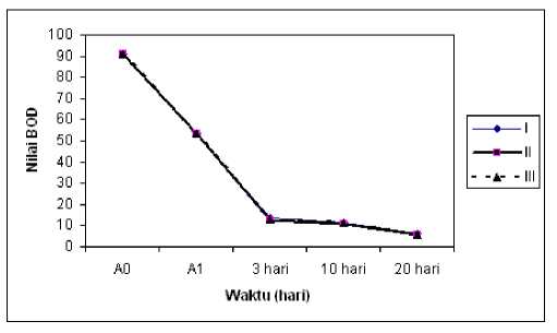 Nilai BOD mengalami penurunan selama proses penyaringan. Penurunan terjadi pada ketiga retensi waktu 3, 10 dan 20 hari. Pemajangan dengan retensi waktu 20 hari memberikan nilai BOD