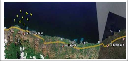 Penentuan titik-titik sampel dilakukan secara acak dan, titik-titik sampel yang dipilih diusahakan mewakili seluruh wilayah studi pengamatan (Gambar 1). Pengukuran parameter fisika dan kimia yang meliputi : suhu, salinitas, kecerahan, warna air, TSS, pH, nitrat, nitrit, BOD5 dan COD serta Amonia. Parameter biologi meliputi : Kelimpahan Plankton, Indeks Keragaman (H’), Indeks keseragaman (E), dan Indeks Dominansi (C).