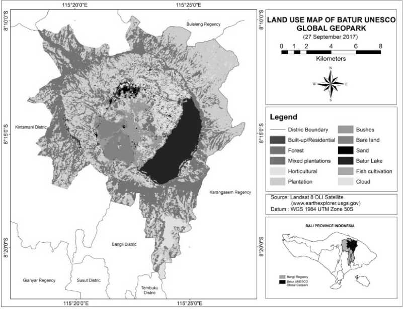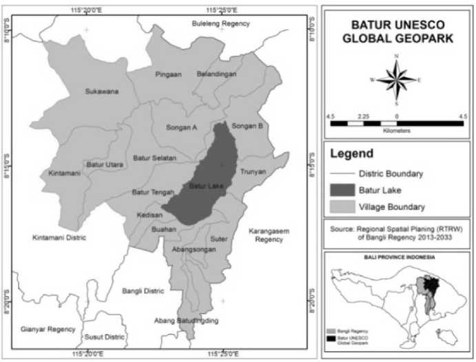 The research location is in Batur UNESCO Global Geopark, Kintamani Distric, Bangli Regency, Bali Province. Geographically located in 08o9’48” S – 08o21’26” S and 115o17’52” E– 115o27’28” E. The total area of Batur UNESCO Global Geopark is 19,422.39 ha or 37.29 percent of Bangli Regency (Figure 1).