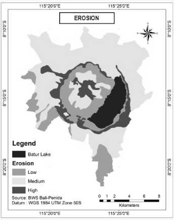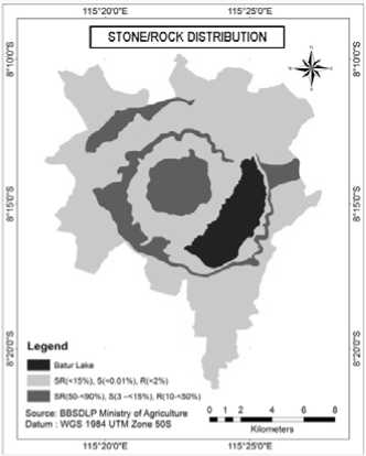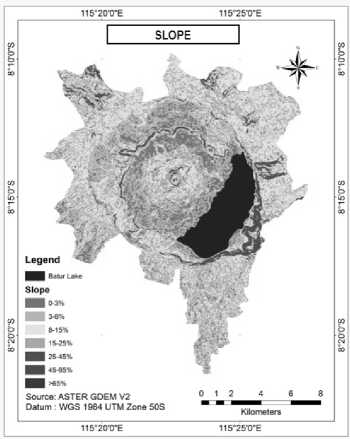 The steepness of slope of land in the Batur caldera region varies from flat to 60%. Distribution of prone areas of landslide in Bangli regency is located in areas that have a slope of land above 40% of which is spread throughout the walls of Batur caldera, both the in and outer caldera and in some spots spread in other Kintamani areas (RTRW, 2013).