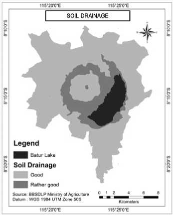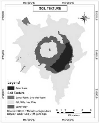 Soil mapping of Research Center of Agriculture Ministry, show Kintamani area consists of litosol, arenosol, and andosol soil type (BBSDLP, 2016). The soil is formed from volcanic ash intermediary with volcanic cone physiology, caldera valley, and volcanic volumes (Nampa, 2011). The shape of the