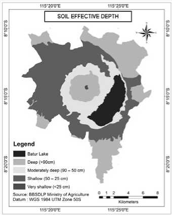 area in Kintamani district is ramps, bumpy, choppy, and mountainous. Effective depth of soil thin to thick, color of soil is generally gray to yellow, with sand texture with less than 40% clay content (RTRW, 2013). The soil chemical properties have a very varied acidity, low organic matter content, basic saturation varies, low adsorption capacity, several of nutrient content, high permeability, and soil sensitivity to large erosion (Nandini, 2012).