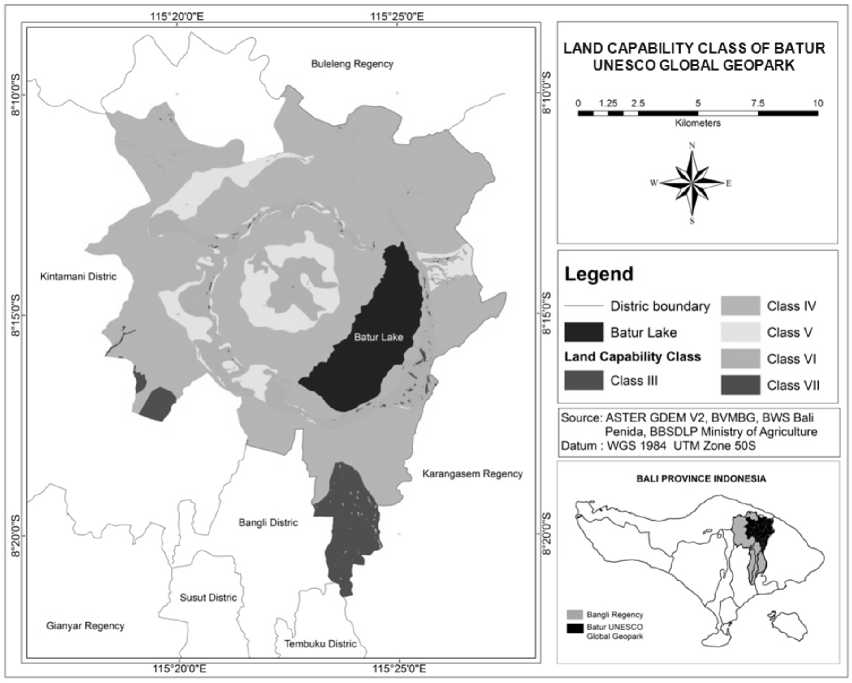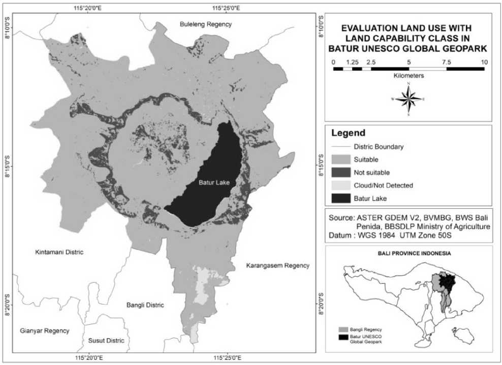 The condition of land capability Batur UNESCO Global Geopark dominated by class IV 12,243.73 ha (68.72%), followed by class VI 2,550.16 ha (14.31%), class V 1,922.14 ha (10.79%), class III 1,046.24 ha (5.87%), and class VII 53.66 ha (0.29%). Evaluation result of land use with land capability class overall has suitable area 15,764.78 ha (88.49%), not suitable area 1,767.48 ha (9.92%) and not detected/cloud interference 283.67 ha (1.59%) of 17,815.93 ha total area. Suggestions for research development and all stakeholders in Batur UNESCO Global Geopark area are: 1) needed further research to use high resolution satellites to obtain higher accuracy, 2) needed public awareness in Batur UNESCO Global Geopark area always refers to land capability class, and 3) local government need to supervise and guide to ensure land use in the UNESCO Batur Global Geopark area always refers to the land capability class.