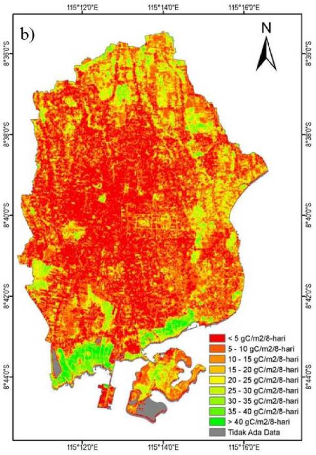 Berdasarkan hasil analisis dengan menggunakan 8 lembar data Landsat 8 diperoleh bahwa nilai total GPP yang di Kota Denpasar berkisar antara 1.336,09 tC/8-hari sampai 1.572,89 tC/8-hari. Nilai tertinggi terdapat pada rentang tanggal 10-17 Mei 2016 dan terendah terdapat pada rentang tanggal 3-10 Februari 2015. Sementara itu bila di hitung per tahun, dengan
