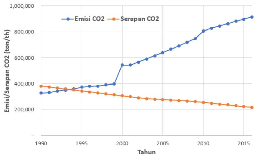 Hasil simulasi terhadap estimasi tutupan vegetasi dan pertambahan penduduk di Kota Denpsar diperoleh bahwa serapan CO2 menurun dari tahun ketahun, sedangkan emisi CO2 meningkat secara signifikan. Gambar 4 menunjukkan terjadi gap yang semakin besar Antara serapan dan emisi CO2 di Kota Denpasar. Perpotongan emisi dan serapan CO2 terjadi pada tahun 1993, yang berarti jumlah serapan dan emisi CO2 pada tahun itu adalah sama. Sebelum tahun 1993 kemampuan vegetasi di Kota Denpasar untuk menyerap CO2 masih lebih besar dari total emisi, sementara setelah tahun 1993 jumlah emisi melebihi kemampuan vegetasi menyerap CO2, dan semakin tahun terjadi gap yang semakin tinggi (Gambar 4).