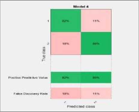 After the classification results are obtained, the next step is to get a scatter plot and confusion matrix diagram from MATLAB software. The type of SVM method used is Fine Gaussian SVM because the accuracy of the results of the data obtained is very high at 87.8%. The results of the scatter plot and confusion matrix diagram are shown in Figure 5 and Figure 6.