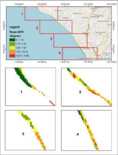 After the graph of the coastline change is obtained, the next step is to analyze the slope of the land in the area that has been digitized. The analysis includes geoprocessing processes, spatial analysis processes and converting the results of spatial analysis in the form of excel. Spatial analysis has a very important role because spatial analysis methods can combine raster data with vector data and spatial analysis provides tools to create surface areas and analyze characteristics such as slope. The function of slope in spatial analysis is to determine the rate of change of each image cell analyzed and produce a slope grid that can be either a percentage unit or a degree unit. The example of slope results using the spatial analysis method are shown in Figure 8.