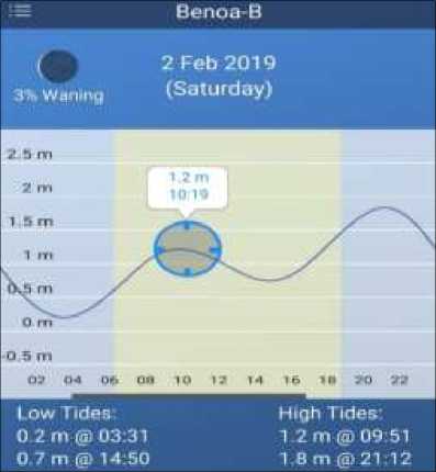 Data needed to calculate tide correction are high water lever data at the study site, high water level data at the closest station to the study site, and tidal height data at the time of image recording. The closest station to the study site is Benoa Station and the image recording time on February 2nd, 2019 is 10: 19 A.M. The data is obtained through the Tides application and then the data is analyzed to perform calculations by entering the following formula.
