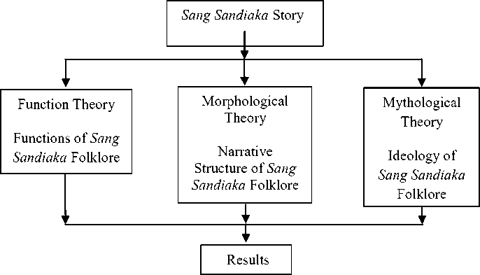 Based on the concepts of folklore and ideology presented above, then in this study three theories were used to explain the structure of narrative, functions and find ideologies contained in the Sang Sandiaka story, namely (1) the morphological theory of folklore which was used to analyze the form of the Sang Sandiaka folklore narrative, (2) the folklore social function theory which was used to analyze the function of the Sang Sandiaka story, (3) mythological theory which was used to examine the ideologies in the Sang Sandiaka story.