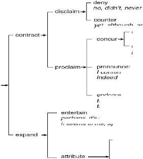 1. Disclaim – voice position of rejecting, supplanting or some contrary position. It is then subtyped into disclaim ‘deny (negation)’ and disclaim ‘counter’. Deny is realized in such locutions, no, not, never, nothing, wrong and any other denial words. While, counter is conveyed by conjunctions such as although, however, yet and but, by adjuncts such as even, only, just, surprisingly, still.