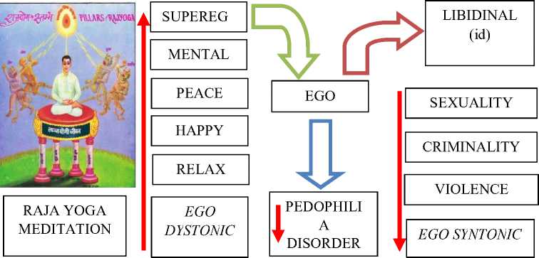 Due to instability of neurotransmitter function in the brain of pedophile causing decrease libidinal (id) and increased superego function to control sexual behavior. There is a decreased libidinal (id) of a person with selfcontrol of the superego in the meditation of Raja Yoga.[30]