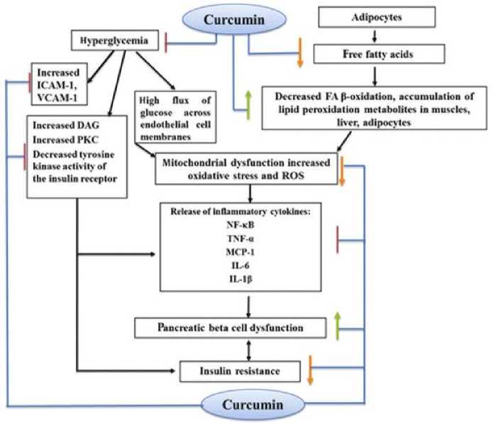 Lipotoksisitas yang diinduksi oleh FFA merupakan kontributor penting dari resistansi insulin. Mekanisme ini telah ditemukan untuk memburuk fungsi sel β pankreas dan merusak jalur signaling insulin melalui aktivasi NF-kb. Produk akhir dari jalur NF-kb, IL-6 tersebut, mengganggu transkripsi reseptor insulin (seperti insulin receptor substrate-1) dan transporter glukosa (seperti GLUT-4), sehingga merusak sensitivitas insulin. Yang terakhir, kurkumin dapat menginduksi aktivasi peroxisome proliferator-activated receptor-gamma.21 Adapun semua mekanisme di atas disajikan dalam diagram pada Gambar 2.