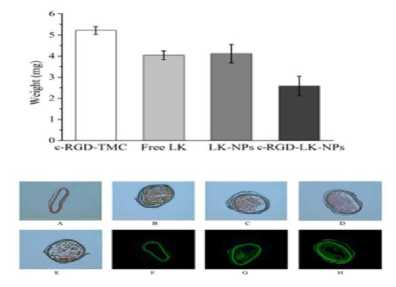 Discussion: Lumbrokinase is an enzyme from the extraction of the earthworm’s digestive tract which consists of several serine protease isoenzymes. As a fibrinolytic agent, lumbrokinase can hydrolyze both fibrin or fibrinogen and also activate plasminogen into plasmin. Besides, lumbrokinase is known as has an antiplatelet effect as aspirin has. The use of TMC as the carrier can increase the bioavailability of lumbrokinase. Meanwhile, the addition of c-RGD ligand can increase the specificity preventing fibrinogen to bind the GPIIb/IIIa receptor thereby inhibiting thrombus formation.