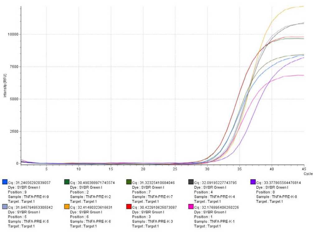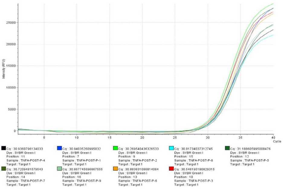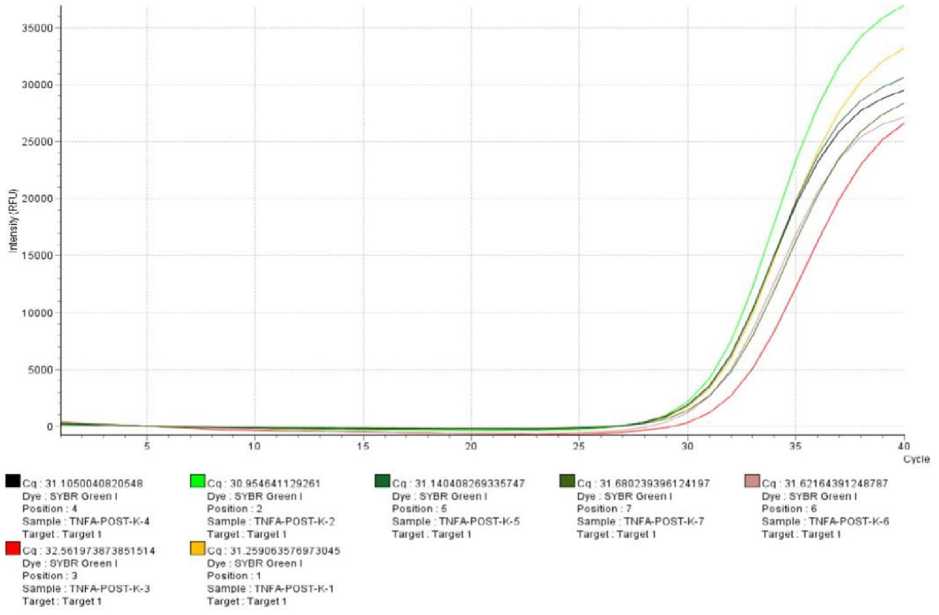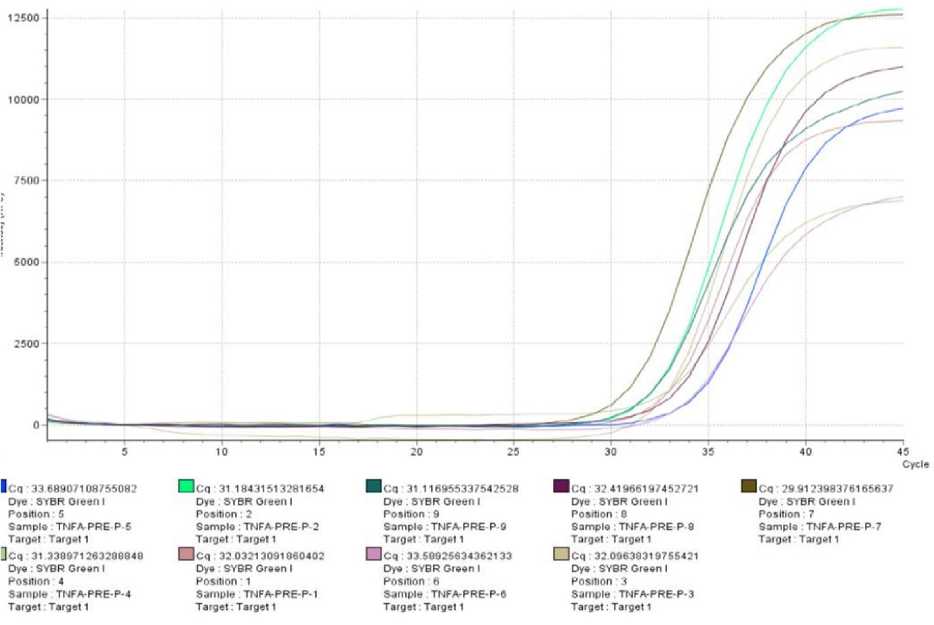 Figure 1 Curve of quantitative real time PCR (qRT-PCR) amplification results of TNF-α mRNA expression from research samples