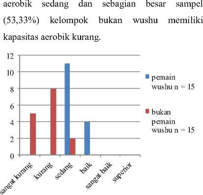 Hasil pengukuran nilai VO2 maks pada kelompok pemain wushu didapatkan sebanyak 11 orang (73,34%) masuk dalam kategori VO2 maks sedang dan 4 orang (26,66%) masuk dalam kategori baik. Sedangkan pada kelompok bukan pemain wushu sebanyak 5 orang (33,33%) masuk dalam kategori VO2 maks sangat kurang, 8 orang (53,33%) kategori kurang, dan 2 orang (13,33%)