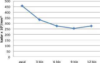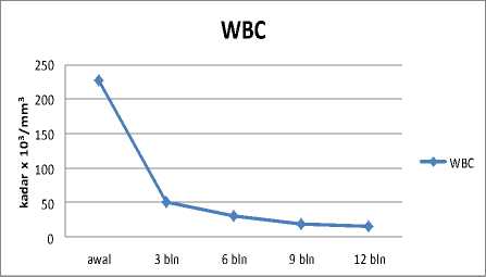 Dari grafik di atas dapat dilihat kadar sel darah putih, dari rata rata wbc 227,59 ± 22,03 x 103/mm3 saat awal diagnosis menjadi 50,00 ± 13,29 x 103/mm3 setelah 3 bulan, lalu rerata wbc menjadi 30,08 ± 8,58 x 103/mm3 setelah 6 bulan mendapat pengobatan TKI. Setelah 9 dan 12 bulan mendapat pengobatan TKI rerata wbc menjadi 18,55 ± 6,13 x 103/mm3 saat 9 bulan dan 14,61 ± 3,45 x 103/mm3 setelah 12 bulan mendapat pengobatan TKI.