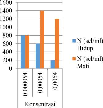 didapatkan jumlah sel yang hidup sebanyak 800 sel/ml dan jumlah sel yang mati sebanyak 800 sel/ml. Pada konsentrasi ekstrak 0,00054 gram/ml diperoleh jumlah sel yang hidup sebanyak 600 sel/ml dan jumlah sel yang mati sebanyak 1400 sel/ml. Sedangkan, pada konsentrasi ekstrak 0,0054 gram/ml didapatkan jumlah sel yang hidup sebanyak 200 sel/ml dan jumlah sel yang mati sebanyak 1200 sel/ml. Sehingga dari hasil pengujian didapatkan LD50 pada konsentrasi ekstrak sebesar 0,000054 gram/ml.