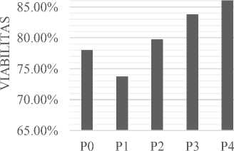 Persentase viabilitas sel limfosit yang hidup pada pengujian ini disajikan dalam Gambar 3. Pada kelompok P0 sebesar 78,04%, kelompok P1 sebesar 73,76%, kelompok P2 sebesar 79,76%, kelompok P3 sebesar 83,78%, dan kelompok P4 sebesar 86,07%. Sehingga dari data tersebut didapatkan bahwa persentase viabilitas sel limfosit tertinggi pada kelompok perlakuan P4 dengan konsentrasi 0,0000054 gram/ml.
