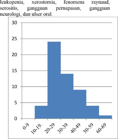 dengan umur 30-39 tahun. Ini menunjukan bahwa penderita SLE terbanyak adalah pada usia reproduktif. Hal ini sesuai dengan literatur epidemiologi SLE yaitu puncak frekuensi terjadinya SLE pada usia reproduktif yaitu 20-30 tahun.8,9