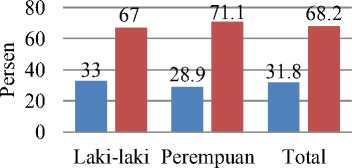 Gambar 1 menunjukkan prevalensi total sampel yang memiliki glukosa darah puasa ≥130 mg/dl sebesar 68,2%, sedangkan prevalensi total sampel yang memiliki glukosa darah puasa <130 mg/dl sebesar 31,8%. Persentase perempuan yang memiliki glukosa darah puasa ≥130 mg/dl lebih tinggi dibandingkan laki-laki.