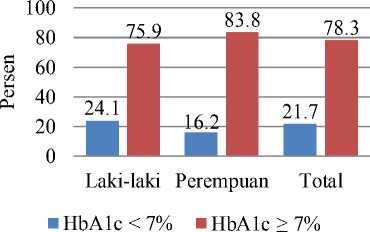 Gambar 2 menunjukkan prevalensi total sampel yang memiliki HbA1c ≥7% sebesar 78,3%, sedangkan prevalensi total sampel yang memiliki HbA1c <7% sebesar 21,7%. Persentase HbA1c ≥7% ditemukan lebih tinggi pada perempuan daripada laki-laki.