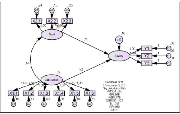 Gambar 1. Model SEM pengaruh kepuasaan dan kepercayan terhadap loyalitas konsumen kedelai Jepang Edamame
