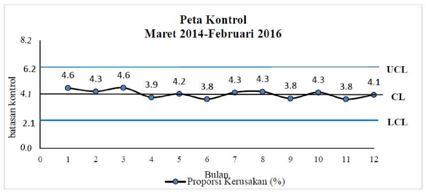 Berdasarkan data grafik peta kontrol di atas, proporsi kerusakan selama Maret 2014 s.d Februari 2015 berada dalam batas kendali. Proporsi kerusakan tertinggi terjadi pada bulan pertama yaitu Bulan Maret 2014 dengan tingkat kerusakan sebesar 4,6 % dan proporsi kerusakan terkecil terjadi pada Bulan ke 6, 9 dan 11 yaitu Bulan Agustus, November dan Januari dengan proporsi kerusakan sebesar 3,8 %. Tinggi rendahnya proporsi kerusakan yang terjadi pada CV Sari Alam Pegunungan terjadi karena beberapa faktor, diantaranya yaitu hasil penjemuran yang tidak memenuhi standar perusahaan yaitu 10% s.d 12%, mesin yang tidak bekerja dengan baik serta pengawasan terhadap penerapan prosedur kerja yang kurang ketat.
