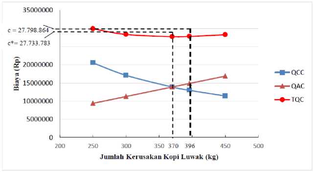 Berdasarkan grafik perbandingan total biaya atas mutu optimum (TQC*) dengan total biaya atas mutu yang benar-benar terjadi pada perusahaan (TQC) memperlihatkan bahwa biaya-biaya mutu yang dikeluarkan oleh perusahaan sudah cukup efisien/optimal. Hal ini dapat dilihat dari selisih perhitungan tingkat kerusakan dan total biaya atas mutu pada perusahaan dengan yang optimum relatif kecil dan dapat ditoleransi, yaitu dengan selisih total biaya atas mutu (TQC) sebesar Rp. 65.081 dan selisih tingkat kerusakan kopi luwak sebesar 26 Kg.