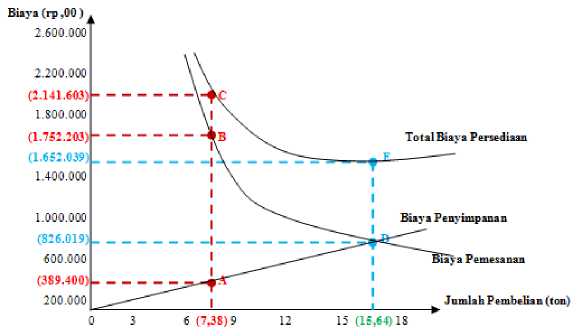 Gambar 1 menjelaskan bahwa garis biaya pemesanan dan penyimpanan berpotongan disaat perusahaan melakukan pemesanan sebesar 15,64 ton berdasarkan perhitungan EOQ, dimana total biaya pemesanan dan penyimpanan jumlahnya sama yaitu sebesar Rp 826.019,00. Efisiensi total biaya persediaan yang didapat sebesar Rp 489.565,00.