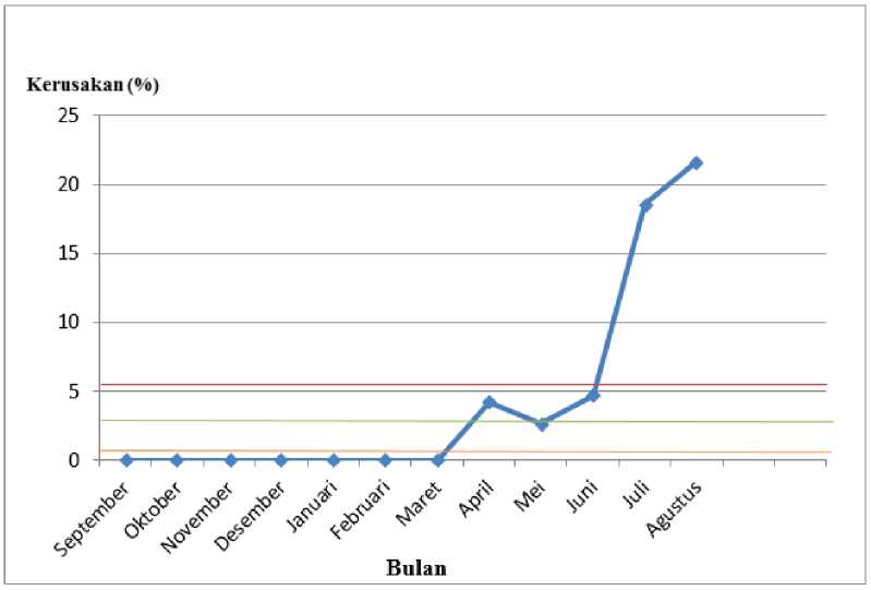 Berdasarkan Gambar 1 peta kendali di atas diperlihatkan bahwa data yang diperoleh pada umumnya berada dalam batas kendali, kerusakan pada bulan Juli dan Agustus berada diluar batas kendali. Hal ini terjadi pada saat BULOG Divre Bali mendapat transfer persediaan beras dari BULOG Divre lain. Pada periode bulan April s.d Agustus Bali mengalami kemarau panjang sehingga harus mentransfer beras dari BULOG lainnya, yang dimana beras tersebut telah mengalami penyimpanan saat tiba di BULOG Divre Bali.