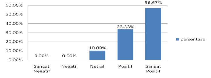 Berdasarkan Gambar 3.6 dapat dilihat pada total distribusi frekuensi ke tiga variable kualitas berdasarkan persepsi ke-30 responden. Dimana dari total keseluruhan persepsi responden didapatkan hasil tertinggi yaitu 50% (positif) dan 43,33% (sangat positif) dan 6,67% (netral), maka secara keseluruhan total ke tiga variabel kualitas dikatakan positif atau paling diharapkan konsumen.