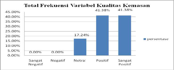 Berdasarkan Gambar 3.3 dapat dilihat pada total distribusi frekuensi variabel kualitas kemasan berdasarkan persepsi ke-30 responden. Dimana dari total keseluruhan persepsi responden didapatkan hasil tertinggi yaitu 41,38% (sangat positif) dan 41,38% (positif) dan 17,24% (netral), maka secara keseluruhan total variabel kualitas kemasan dikatakan sangat positif atau paling diharapkan konsumen.