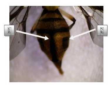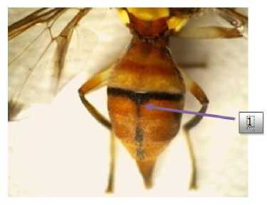 1) Abdomen didominasi berwarna coklat orange dengan pola T berwarna hitam yang lebar dan jelas, 2) Pola hitam berbentuk segi empat pada tergum IV
