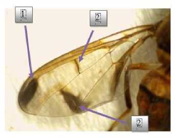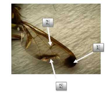 1) Sayap dengan pita coklat gelap pada garis costa membentuk spot pada ujung (apeks) sayap, 2) Pita coklat gelap juga terdapat pada garis anal (cubitus) dan vena melintang r-m dan dm-cu