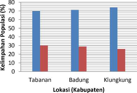 Hasil analisis kelimpahan relatif menunjukkan komposisi populasi B. cucurbitae cenderung mendominasi pada setiap kabupaten dibandingkan dengan B. calumniata. Kelimpahan populasi spesies B. cucurbitae di Kabupaten Tabanan (69,7 %), Kabupaten Badung (71,2 %) dan Kabupaten Klungkung (74%), sedangkan kelimpahan populasi spesies B. calumniata di Kabupaten Tabanan (30,2%), Kabupaten Badung (28,8%) dan Kabupaten Klungkung (26%) (Gambar 1).
