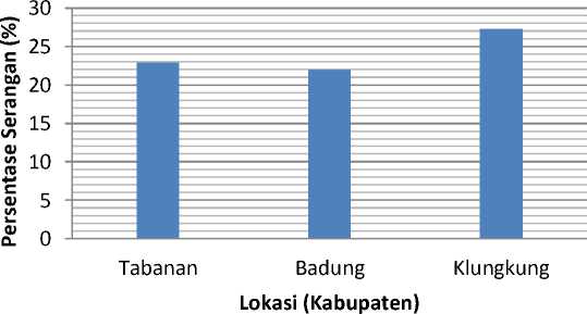Hasil analisis data untuk persentase serangan lalat buah pada buah mentimun didapatkan hasil bahwa di Kabupaten Klungkung persentase serangannya lebih tinggi yaitu sebesar 27,3 %, sedangkan di Kabupaten Tabanan persentase serangannya sebesar 22,9 % dan Kabupaten Badung sebesar 22 % (Gambar 2). Perbedaan persentase serangan lalat buah tersebut menunjukkan ada berbagai aspek yang
