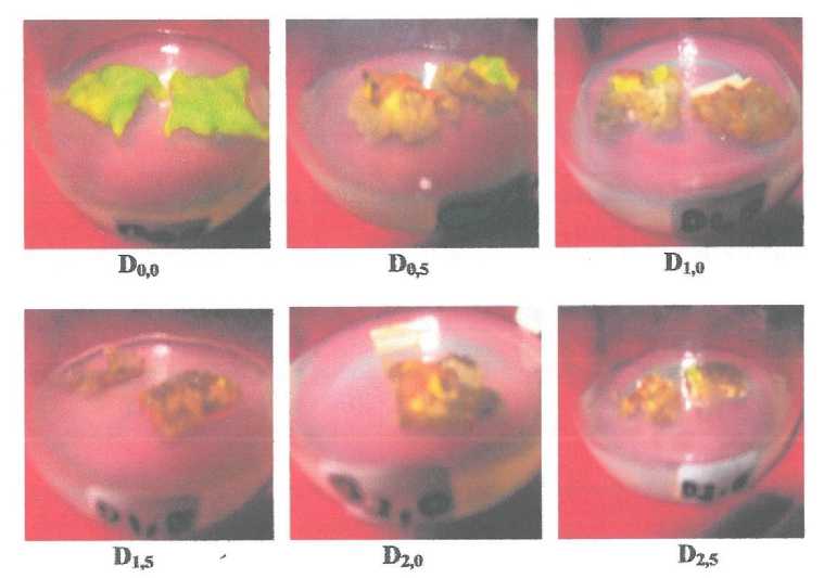Semua peerlakuan dari awal pertumbuhan kalus berwarna putih kekuningan, setelah beberapa hari terjadi perubahan warna kalus menjadi kuning kecoklatan pada kosentrasi 2,0 ppm dan 2,5 ppm 2,4-D (Gambar 7). Hal ini menandakan bahhwa peningkatan kosentrasi 2,4-D dapat memicu terjadinya oksidadi senyawa fenolik menjadi quinon yang menyebabkan pencoklatan pada kalus. Vickery dan vickery 1980 dalam Fitriani (2002) menyatakan bahwa sintesis senyawa fenolik dipacu oleh cekaman atau gangguan pada sel tanaman.
