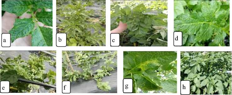 Fig. 1. Symptoms of leaf that infected by the potato virus on land A and B. a. malformation, b. rolling, c. mosaic, d. rugose, e. dwarf, f. witchesbroom, g. mottle, h. normal leaves.