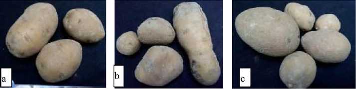 a. Healthy tubers (control); b. Tubers of infected symptomatic plants that infected by the PVX and PVS (long tubers, tuber malformations, tubers growing) c. Tubers from mosaic symptomatic plants that infected by the PVS (scaled tuber skin, tuber malformation).