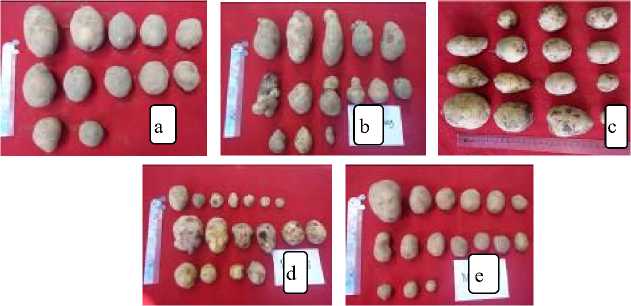 Description: a. Healthy tubers (control); b. Tubers from symptomatic plants to roll up infected PVY (long tuber, tuber stick together, tuber such as ginger rhizome); c. Potato tubers from mammal-infected plants infected with PVS, PVY and PLRV (more conical bulbs); d. Tubers from witchesbroom symptomatic plants infected with PVS and PVY (tuber malformations, small tuber size); e. Tubers from symptomatic plants infected leaf malformation of PVS and PVY (tuber malformation, small tuber size).