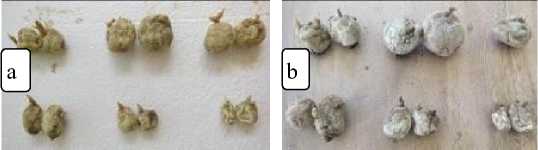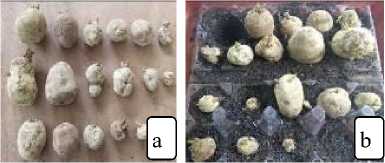 a. before thermotherapy (good tuber), b. after thermotherapy (one rotten tuber, grew roots and shoots on several tubers)