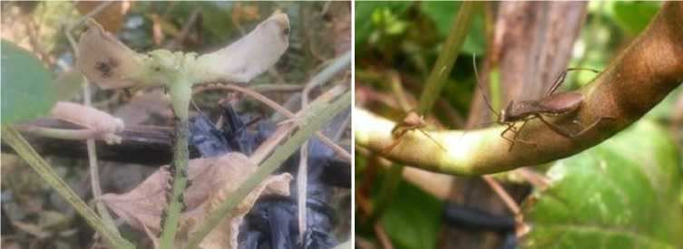 Fig. 3. Aphid attack on cowpea flower (left) and pod sucking bug on pod (right)