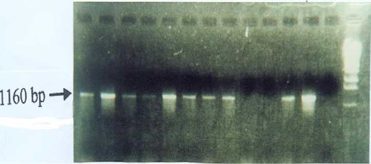 Fig. 1. Amplification Pathogen CVPD in D. citri, T. citricidus, M. dentipes, Leaves of Citrus and Kemuning by PCR Method. 1. Leaves of citrus in the field, 2. Leaves of citrus at laboratory, 3. Flash of citrus in the field, 4. Flash of citrus at laboratory, 5. Adult D. citri in the field, 6. Adult D. citri at laboratory, 7. Nimph D. citri in the field, 8. Nimph of D. citri at laboratory, 9. Adult of T. citricidus, 10. Adult of M. dentipes in the field, 11. Citrus seedling, 12. Leaves of Murraya paniculata, 13. Eggs of D. citri, 14. DNA marker
