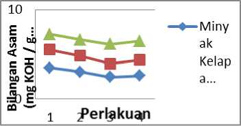 Minyak kelapa B3 mengalami penurunan bilangan asam paling rendah yakni 28,21% kemudian B4 sebesar 20,68% dan B2 sebesar 12,59%. Minyak kelapa C3 mengalami penurunan bilangan asam paling rendah yakni 18,42% kemudian C4 sebesar 14,00% dan C2 sebesar 11,67%.
