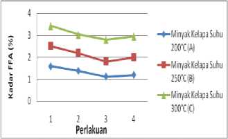 Berdasarkan Tabel 2 diketahui bahwa semakin tinggi suhu yang digunakan untuk memanaskan minyak kelapa maka semakin tinggi pula nilai bilangan peroksida, bilangan asam maupun kadar FFAnya.