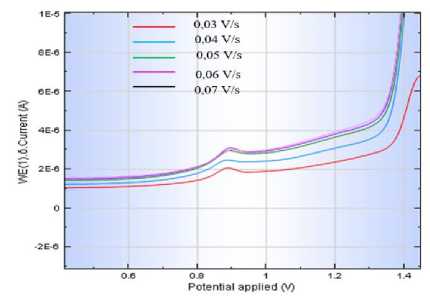 Gambar 1. menunjukkan bahwa scan rate berpengaruh terhadap tinggi arus puncak semakin cepat scan rate yang maka arus yang dihasilkan akan semakin besar, namun terjadi penurunan arus pada scan rate 0,06 dan 0,07 V/s karena kecepatan scan terlalu cepat,
